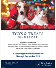 We are collecting toys, food, treats, beds, and blankets for the lovable pets who rely on our community shelters for comfort and care.